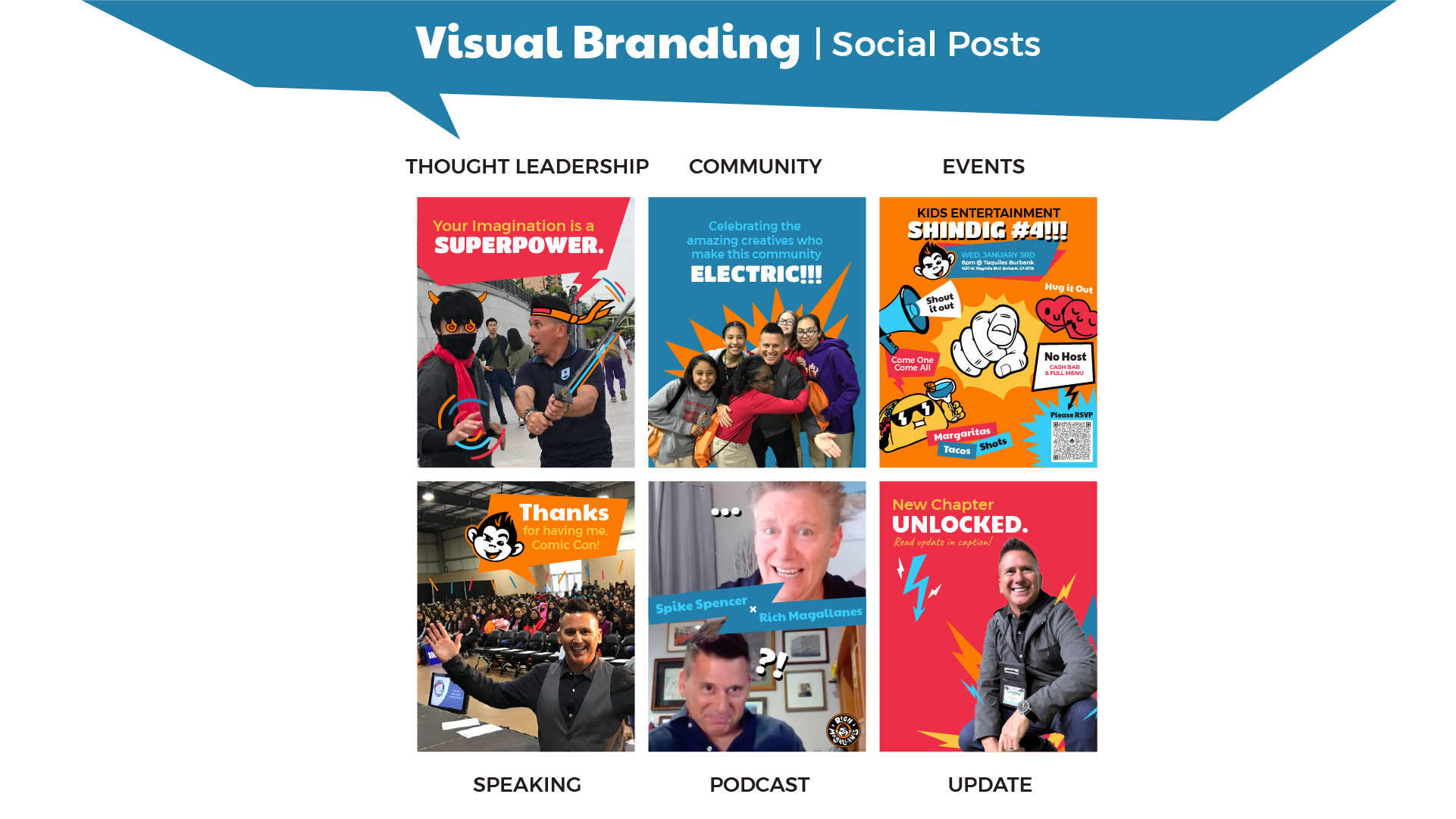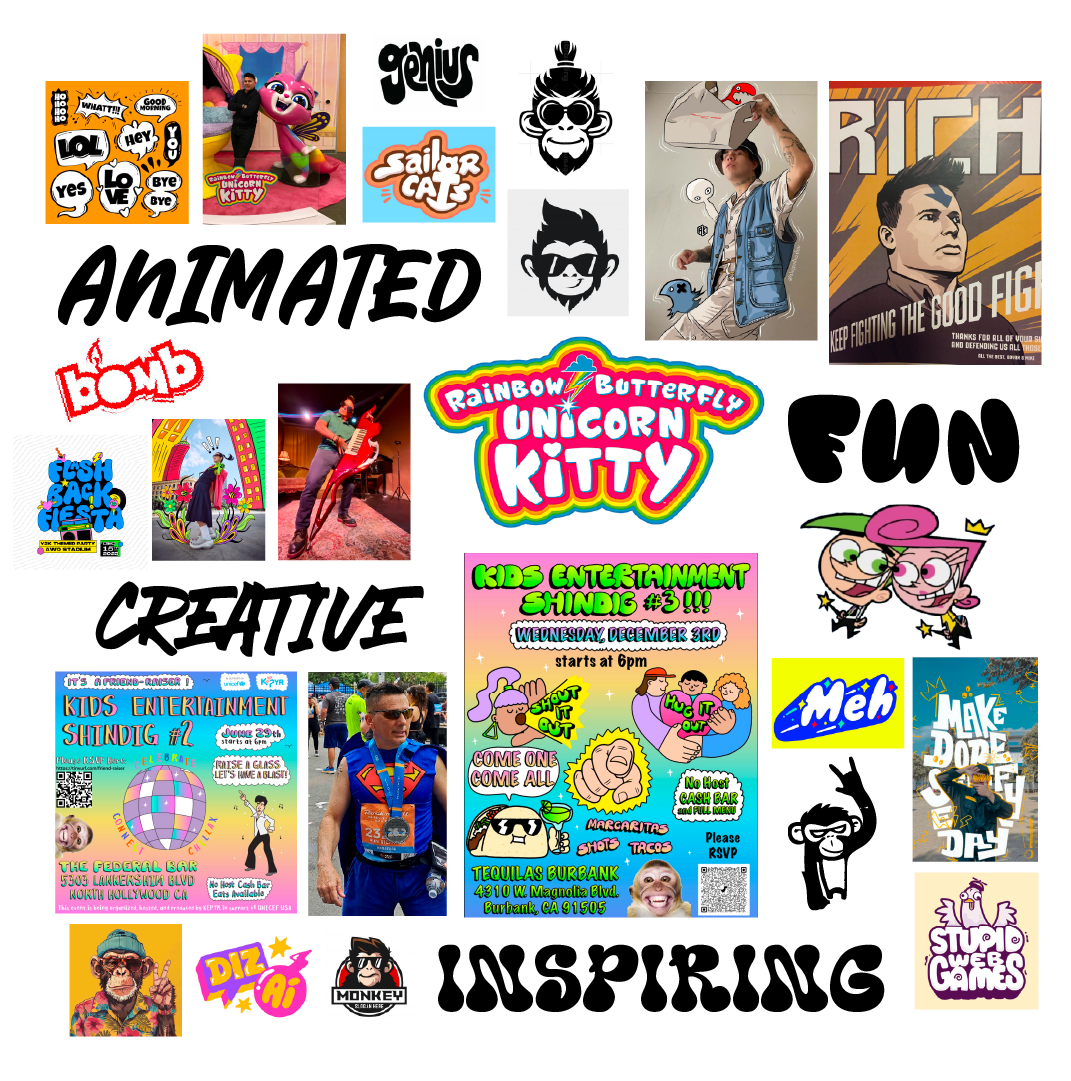 A style that blends fun, color, and personality with the heart and humility that define who you are. It celebrates the duality at the core of your identity: seriously fun and relatably inspiring. Visually, this is represented through a dynamic mix of photography, animation-inspired illustrated elements, bold expressive typography, and playful animated accents that capture Rich’s spark and nod to his roots in animation as a proud, hispanic creative. The result is a look and feel that’s vibrant, energetic and full of movement — capturing the spark Rich brings to everything he does.
